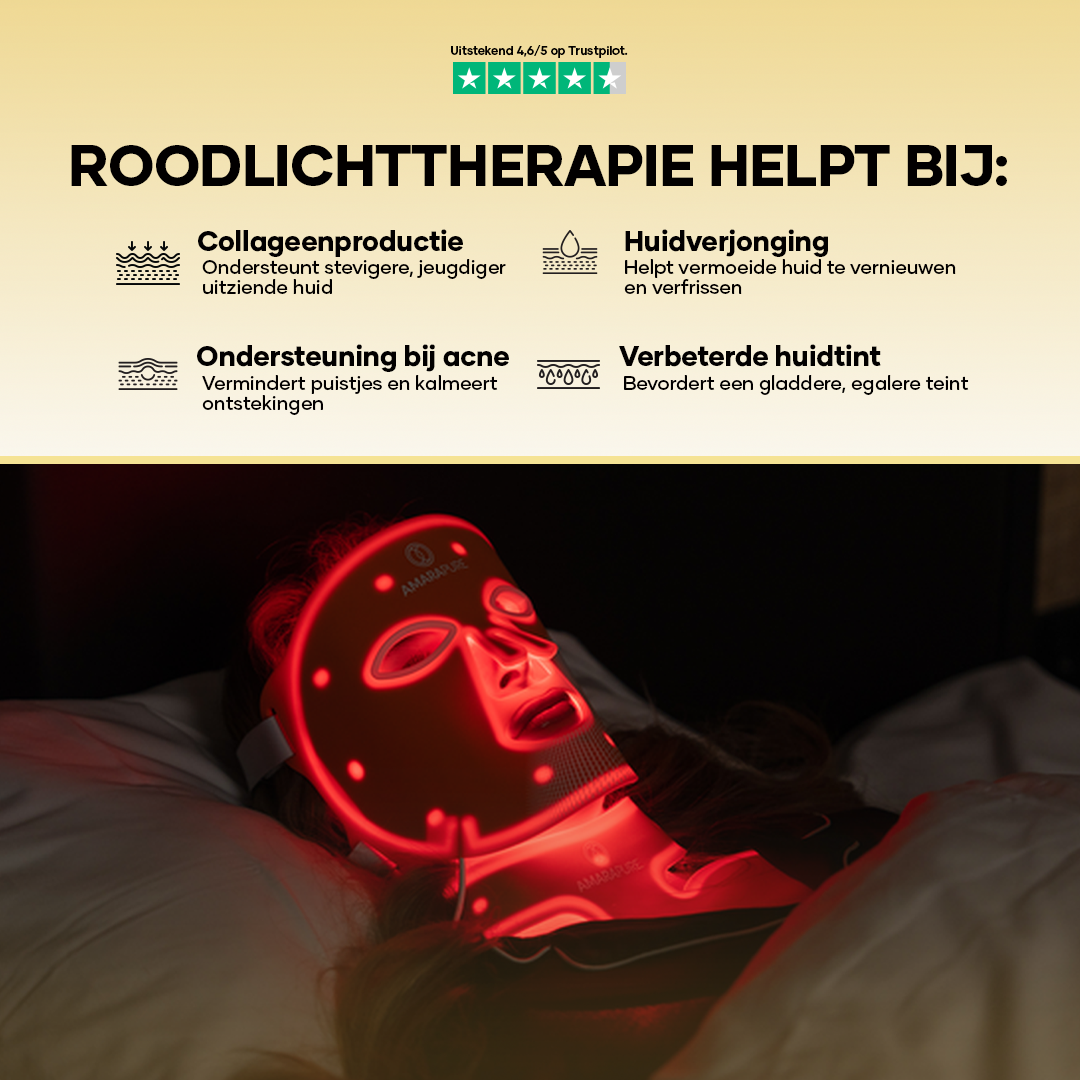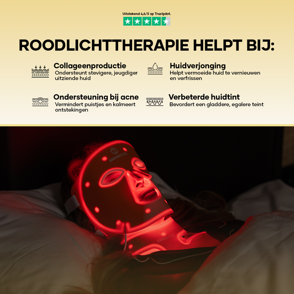 Rødlysbehandling stimulerer kollagenproduktion og forbedrer elasticitet af huden. Dette reducerer fine linjer, rynker og en mat teint — for en synlig glattere og fastere hud.