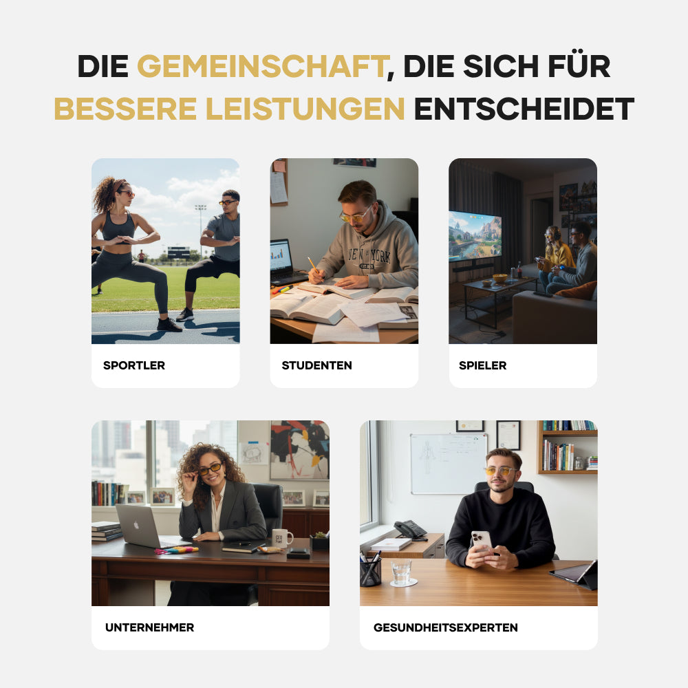Unsere Blaulichtbrillen bieten wissenschaftlich nachgewiesener Schutz für Ihre Augen und Ihren Schlaf. Sie sind ideal für alle, die viel Zeit vor Bildschirmen verbringen, sowohl tagsüber als auch abends.