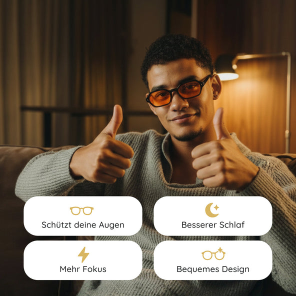 Unsere Blaulichtbrillen bieten wissenschaftlich nachgewiesener Schutz für Ihre Augen und Ihren Schlaf. Sie sind ideal für alle, die viel Zeit vor Bildschirmen verbringen, sowohl tagsüber als auch abends.