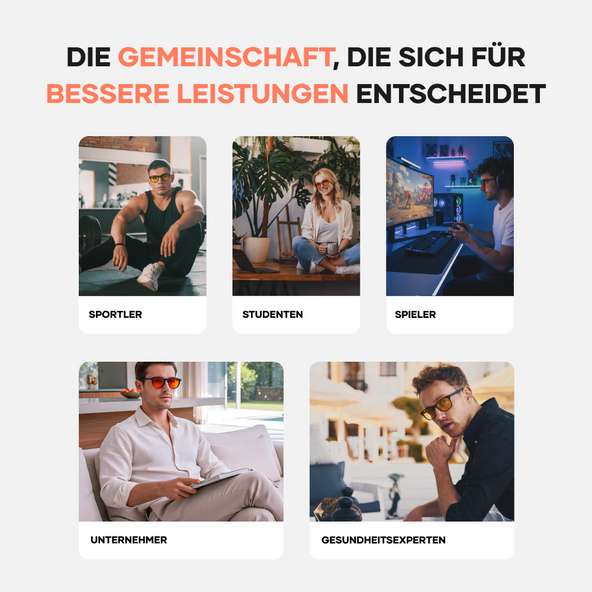 Unsere Blaulichtbrillen bieten wissenschaftlich nachgewiesener Schutz für Ihre Augen und Ihren Schlaf. Sie sind ideal für alle, die viel Zeit vor Bildschirmen verbringen, sowohl tagsüber als auch abends.