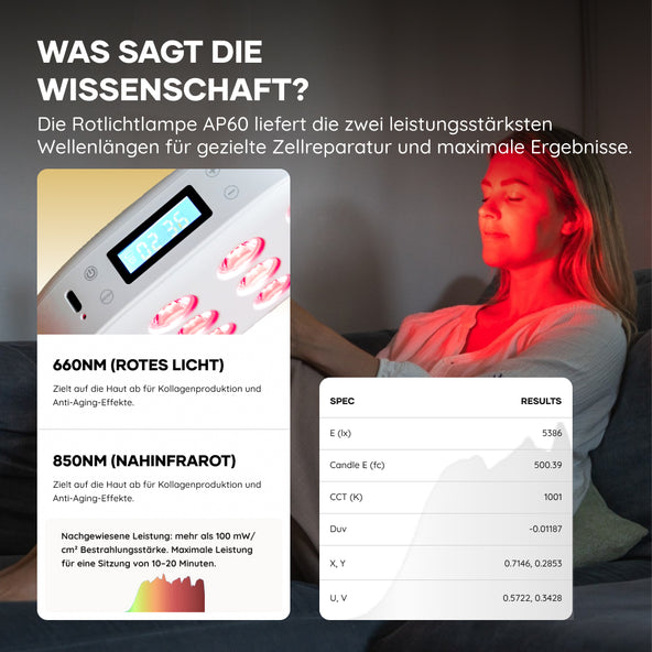 Tipp: Verwenden Sie die Paneele je nach Ihren Zielen 10–20 Minuten pro Bereich. Konzentrieren Sie sich auf Hautstraffung, Hautverjüngung, Muskelregeneration oder Energiestimulation.