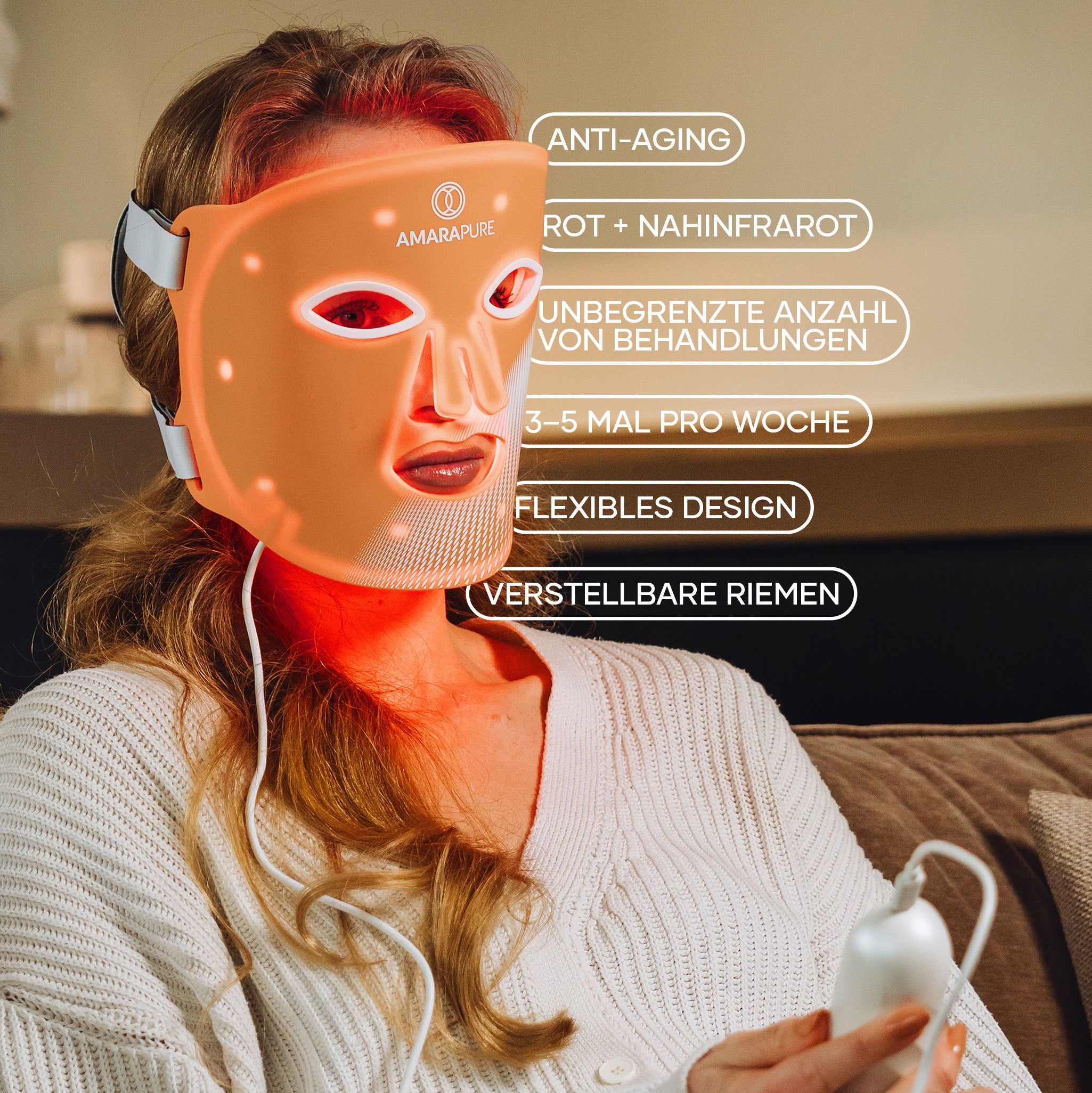 Die Rotlichtmaske stimuliert die Kollagenproduktion und verbessert die Hautstruktur. Ihre Haut fühlt sich straffer, glatter und sichtbar frischer an – jeden Tag aufs Neue.