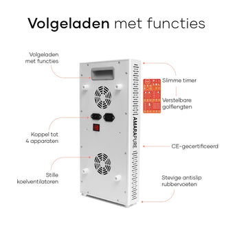 • Afstand & duur: 5–10 minuten per zone als start; bouw op naar 10–20 minuten per gebied. Houd 15–45 cm afstand volgens de handleiding. Start met 3–5 sessies per week.