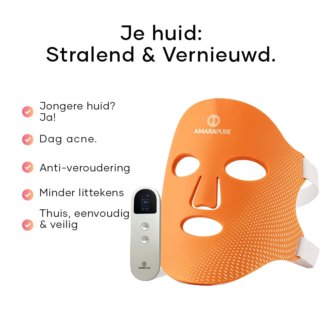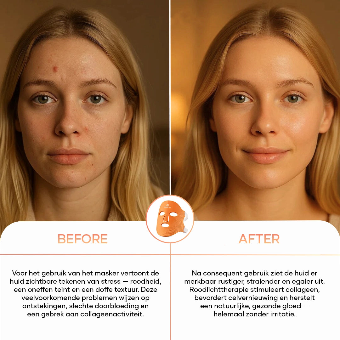 Het LED-licht stimuleert de natuurlijke aanmaak van collageen in de huid, waardoor deze steviger, gladder en jeugdiger wordt. Fijne lijntjes vervagen zichtbaar en de huid krijgt haar natuurlijke elasticiteit terug. Dit gezichtsmasker gebruikt veilige LED-technologie om een professionele huidbehandeling thuis mogelijk te maken zonder chemicaliën, pijn of hersteltijd. Geschikt voor elk huidtype.