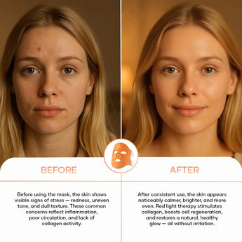 Rødlysmasken stimulerer kollagenproduksjonen og forbedrer hudstrukturen. Huden føles fastere, glattere og synlig friskere — hver dag på nytt.